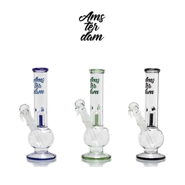 Com 26 cm de altura, este bongo de vidro ‘Amsterdam’ é um bongo de tamanho excelente para usar fora de casa ou dentro de casa. Concebemos este bongo com a intenção de tornar a tua sessão de fumo o mais suave possível. O vidro colorido elegante está presente na boquilha, no logótipo “Amsterdam” na parte da frente e nos entalhes do coletor de gelo (sim, também o tem).