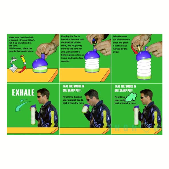 Como utilizar o magnífico cachimbo: Basta expandir o cachimbo Bukket enquanto acende o tabaco ou as ervas na taça, para que a parte central se encha de fumo. Quando estiver totalmente expandido, retire a taça e expulse todo o fumo. Com apenas 5 polegadas de altura quando recolhido, o cachimbo Bukket expande-se até 22 polegadas e parece uma espingarda que dispara diretamente para os pulmões enquanto inala todo o conteúdo num só golpe longo!