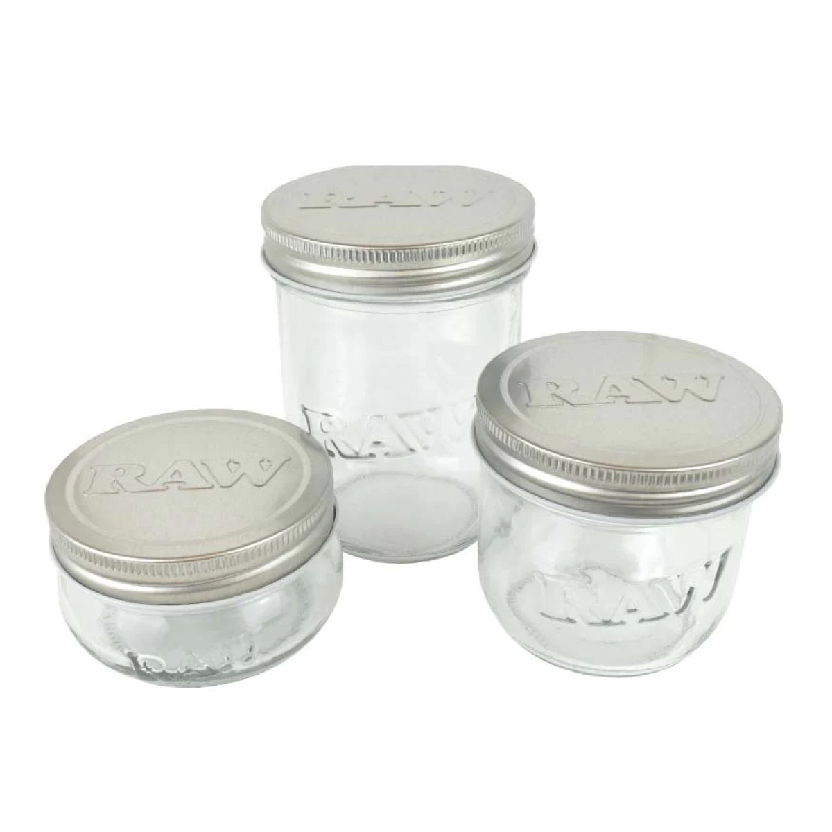 RAW Mason Jar um frasco de vidro resistente, perfeito para cura e preservação. A tampa é de rosca em metal.